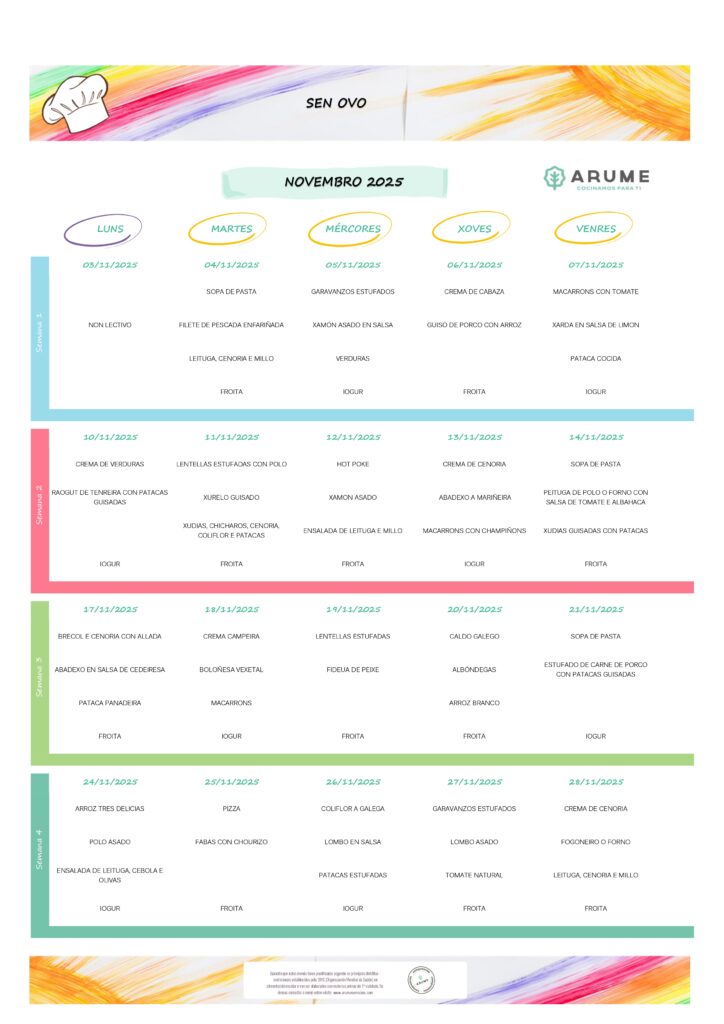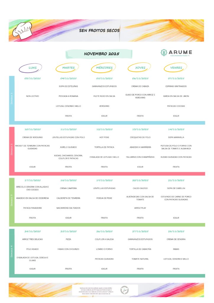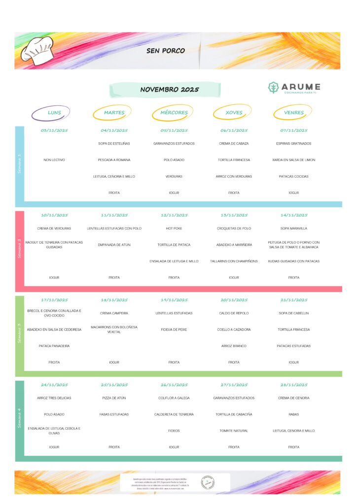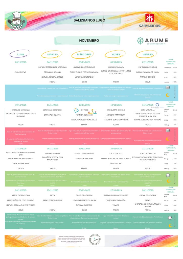 Funciona de setembro a xuño. Mensualmente elabórase un menú equilibrado e detallado para que as familias estean informadas das comidas que se lles dan ós seus fillos e fillas.